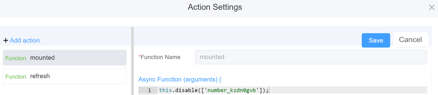 | Action Settings | Click on the drop-down to select the pre-defined methods you wish to apply to your component. In this case, you can choose either mounted or refresh for onChange, onFocus, or onBlur |