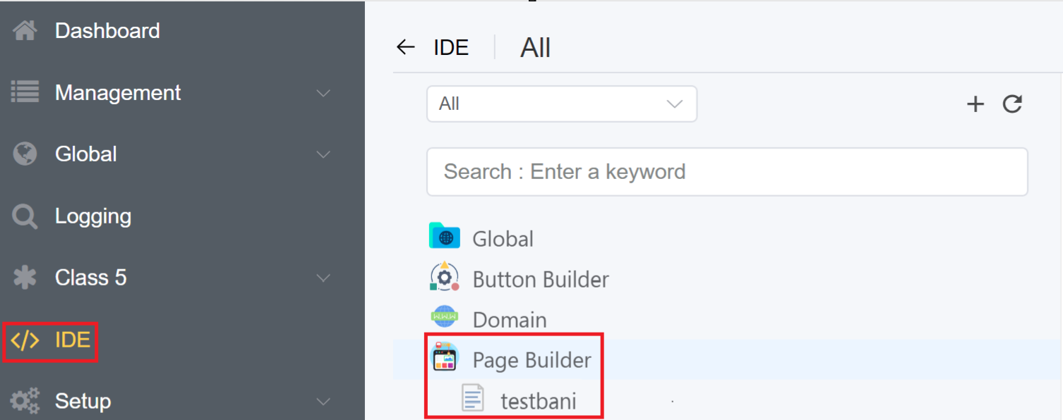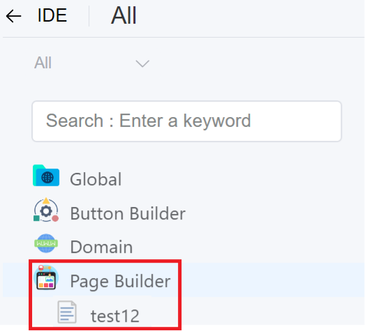 5.The created Page Builder will be visible on the IDE panel under Page Builder. Click on the created Page Builder (test12).