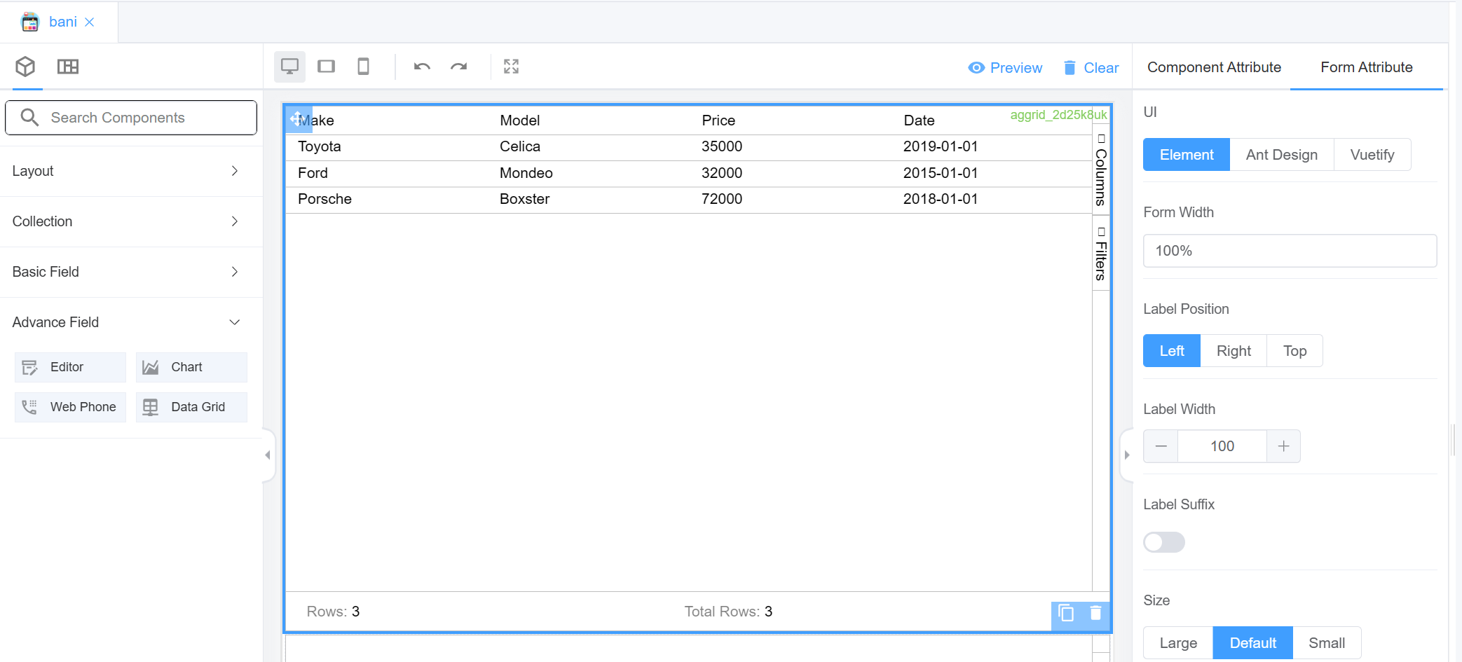 Components in a Page Builder include Alert, Buttons, Sub-Form, Sub-Form+, Table etc.