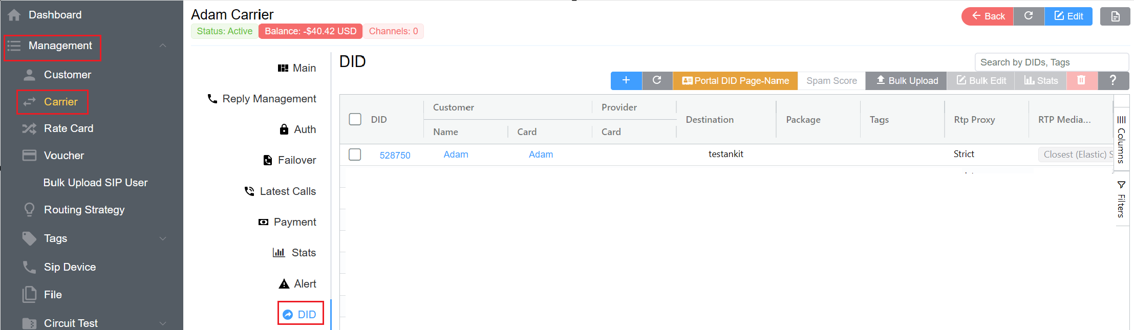 The DID tab displays a list of DIDs that belong to that carrier. You can add new entries with the on the left.