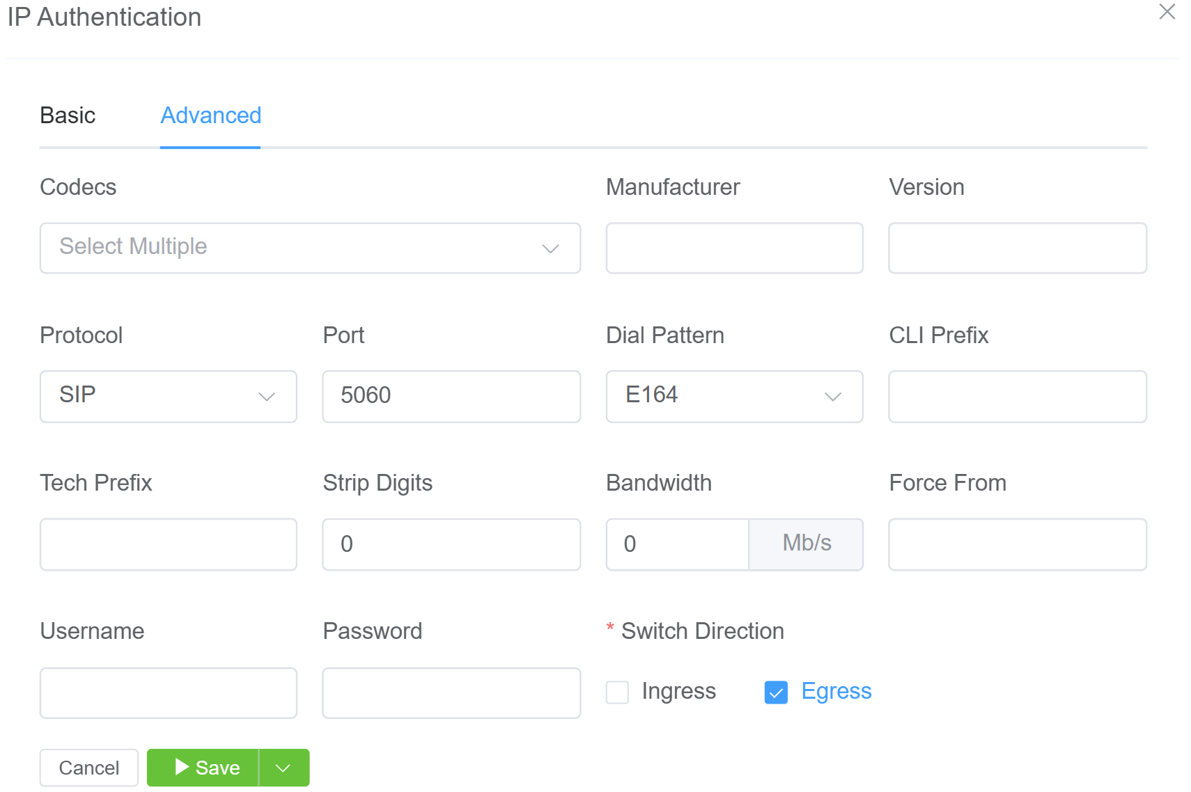 Use the Auth tab to configure IP or SIP (Username / Password) Authentication.