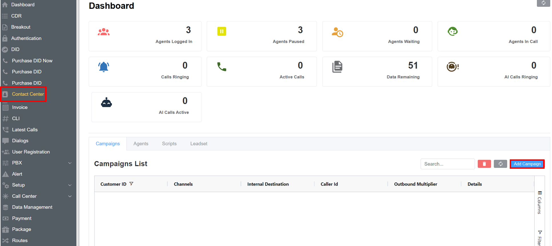 Campaign Overviewwill open. This interface is used for real-time monitoring of campaigns, lead stats, agent statuses, and calling activity.Broadcast Dialer Campaign