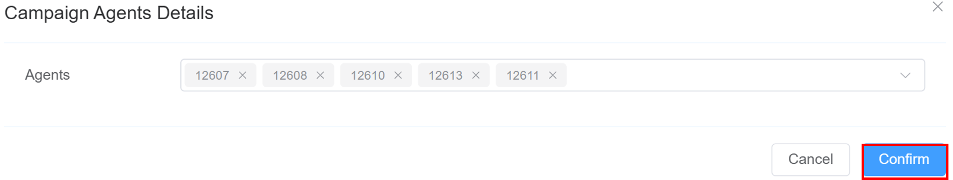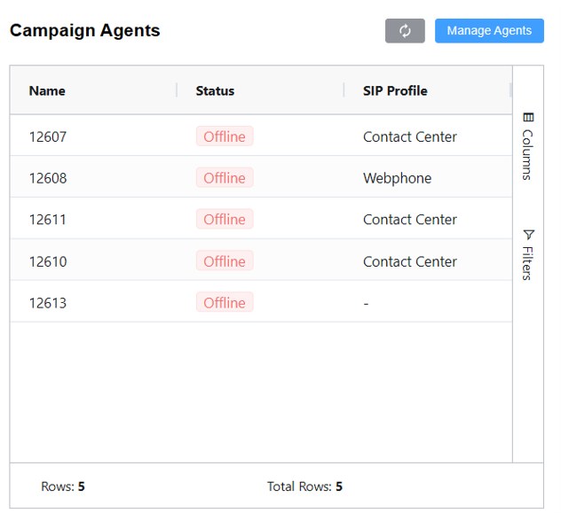 Refresh Button: To update agent statuses.Agents Chart(Only for Preview/Auto Dialer): Shows the status of agents:Call Active: How many agents are currently on a call.Agent Waiting: How many agents are idle (ready and waiting for a call).Campaign Agents(Only for Preview/Auto Dialer): List of agents assigned to the campaign.Manage Agents(Only for Preview/Auto Dialer): Allows you to add/remove agents from the campaign from the drop-down menu. ClickConfirm.