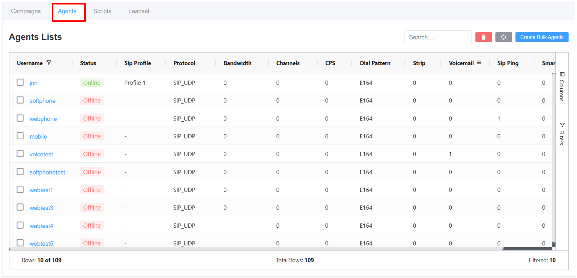 Summarizes ongoing agent activity, displaying parameters like status, SIP profile, protocol, bandwidth, CPS, channels, dial pattern, and other SIP metrics. You can also upload agents in bulk using Create Bulk Agents.