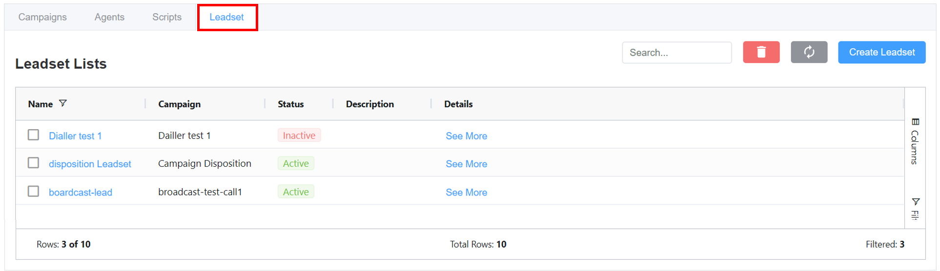 Manages leadsets for outbound campaigns, showing parameters like name, associated campaign, status, and description. You can also create new leadsets individually or upload them in bulk using Create Leadset.