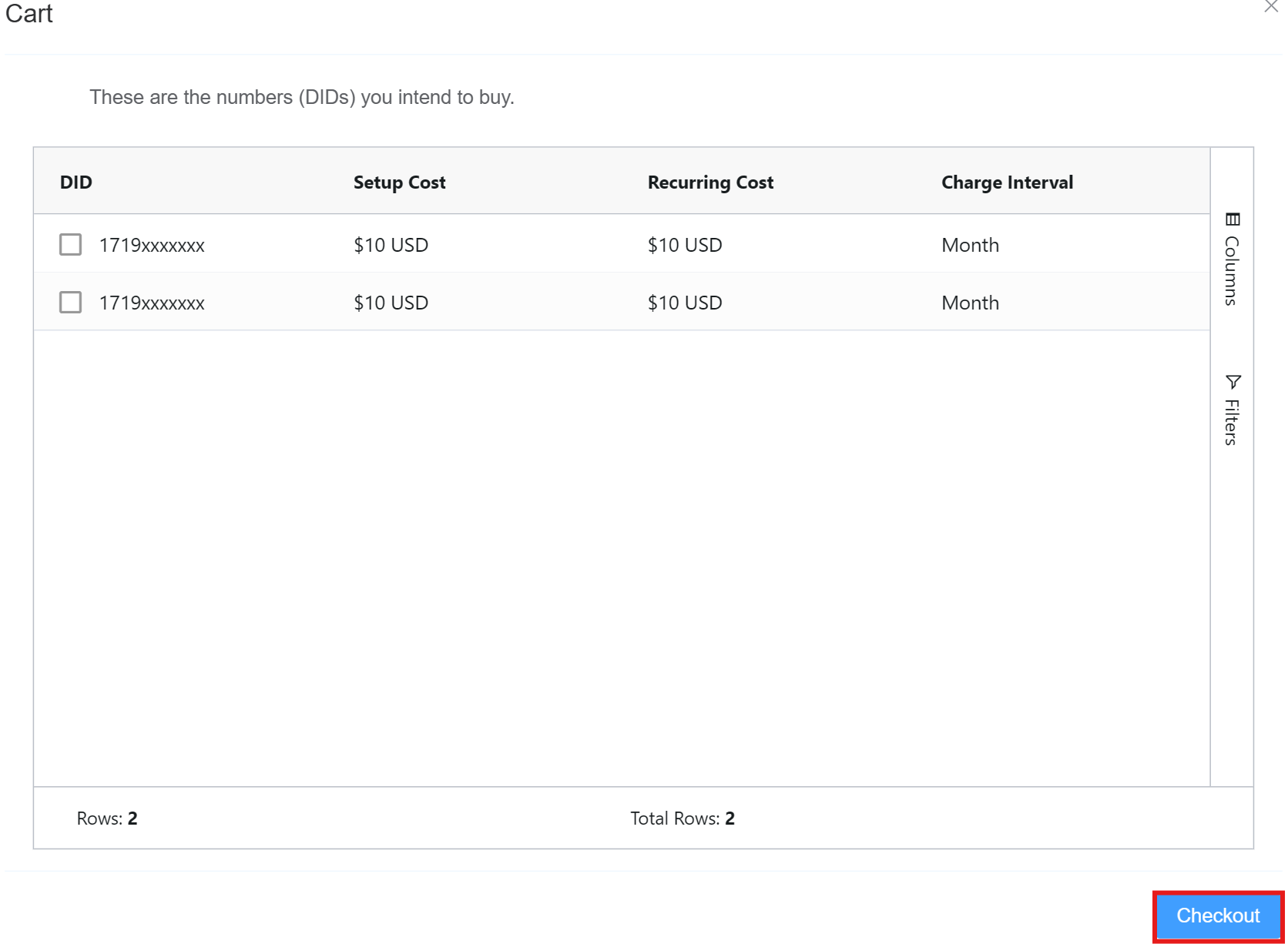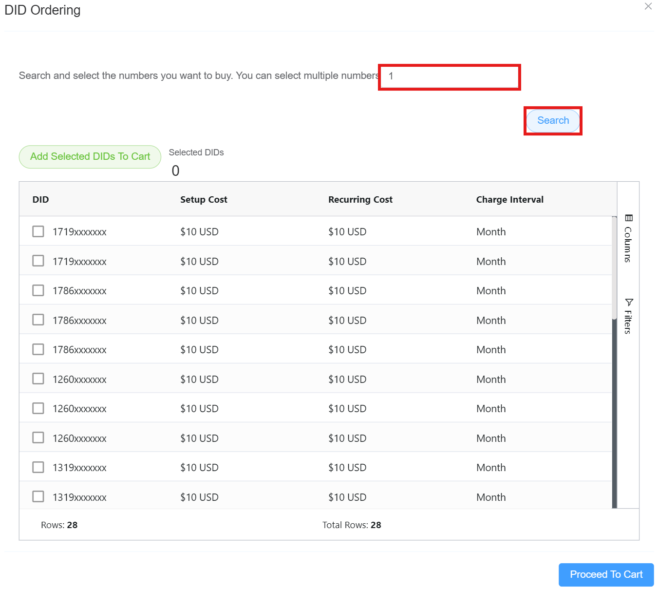 - Select the DIDs you wish to purchase, click on Add Selected DIDs To Cart, then Proceed to Cart.