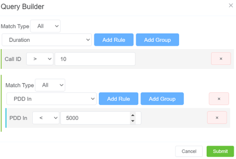 - Advanced query builder allows multi-parameter searching (e.g., calls longer than 10 seconds and PDD less than 5 milliseconds).