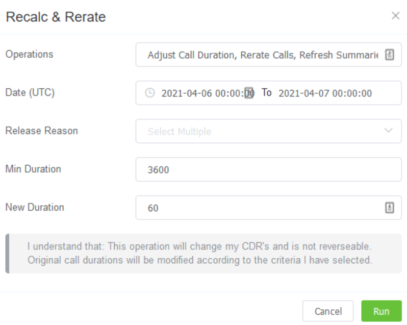 New Duration (for Adjust Call Duration operations) (All the calls with minimum duration of 3600 seconds will be recalculated with the value in the New Duration, for example 60 seconds).