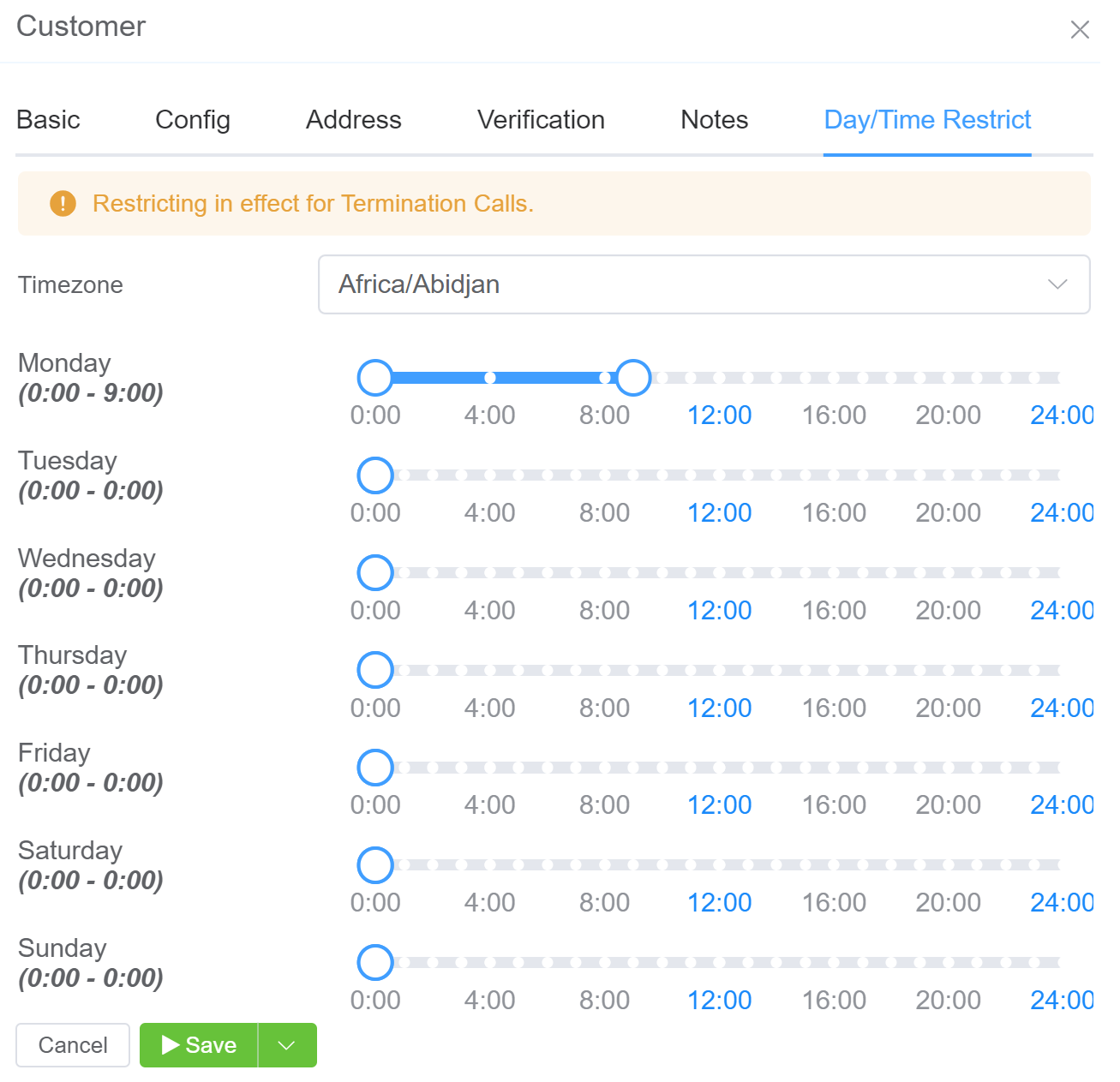 In the image below you can see the time slider starts from 12:00 AM till 8:00 AM, this means your customers are only allowed to dial between 12:00 AM and 8:00 AM. After 8:00 AM your customers won't be able to call. The rest of the slots (grey color) are restricted slots.