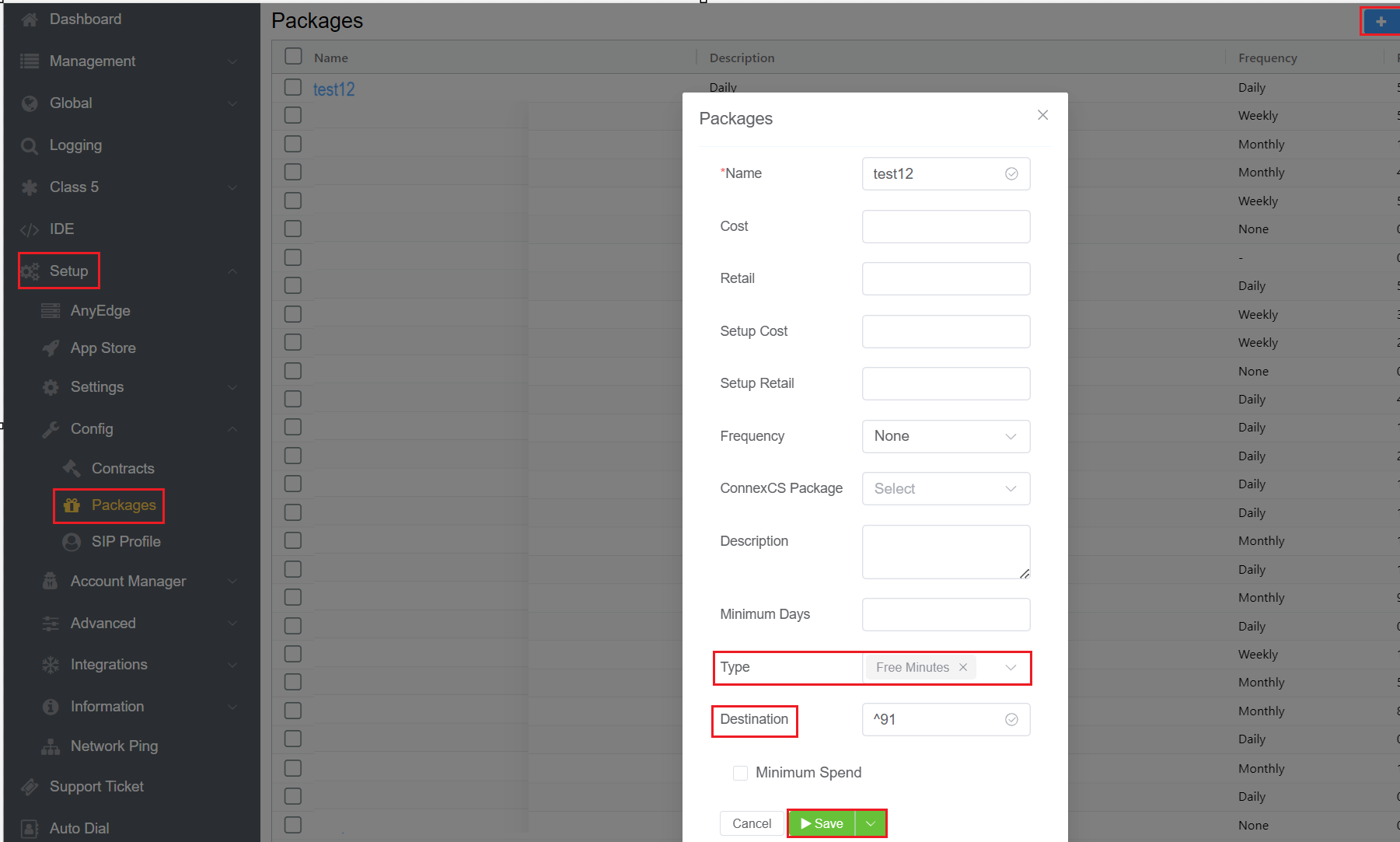 +icon. - Fill in the details and in the Type field select Free Minutes.