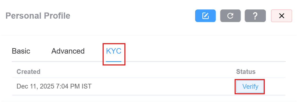 The Know Your Customer (KYC) tab provides access to the customer identity verification workflow. When KYC verification is enabled from the backend, users can complete the verification process directly within this section.