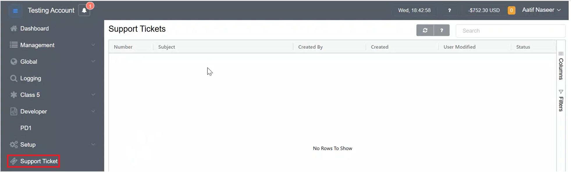 Support Ticket (found at the bottom of the ConnexCS navigation menu) displays all open tickets for an account.