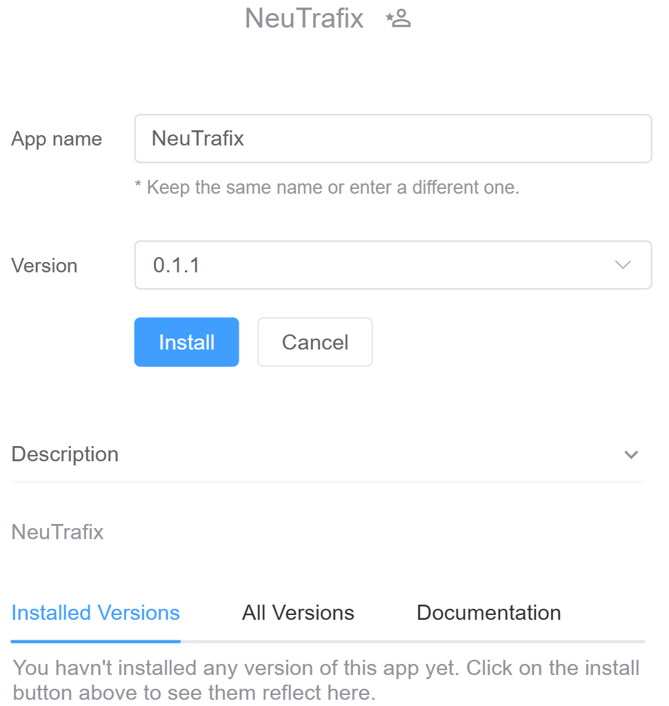 3.After hitting the 'Install' button, a window appears with two fields. The first field is 'App Name', where you can either change the name of the application or keep it the same. The second field allows you to select the Version of the application.