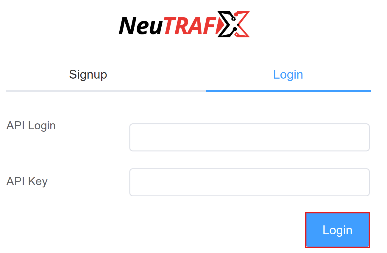 Login. A window will prompt you to enter theAPI LoginandAPI Key. Click onLogin. You can get theAPI LoginandAPI Keyfrom the NeuTrafixDashboard.