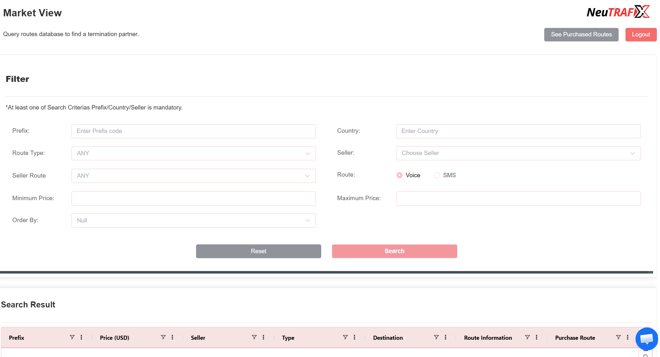 Column Description Technical Meaning Prefix Destination prefix Dialing code covered by the route Price (USD) Route rate Cost per minute/message offered by seller Seller When users click on a seller, they can view the seller’s profile details. Type Route type Traffic category (Voice/SMS or quality classification) Destination Destination name Country or operator served Route Information Route details Technical information about route quality/configuration Purchase Route Action column Button to buy/select the route View More Additional information Available to display additional information -