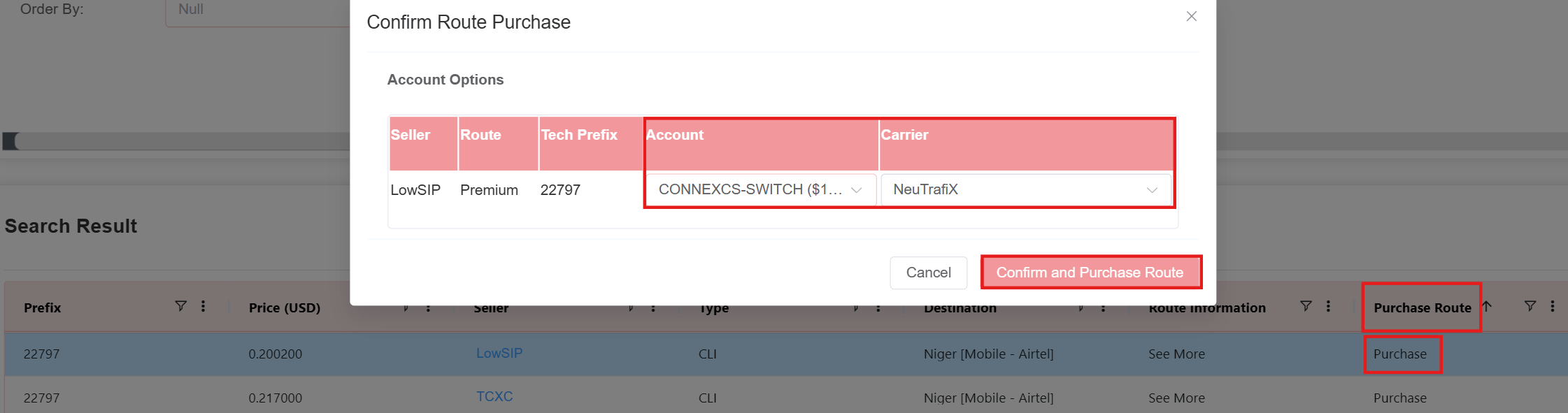 Purchasein thePurchase Routecolumn. A window will open where you need to select theAccountandCarrier. By default the carrier isNuetrafixbut you can also choose the carrier from the drop-down. Click onConfirm and Purchase Route.