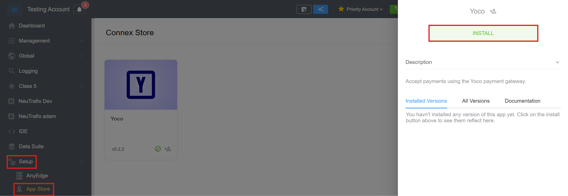 Navigate to Setup App Store Yoco and click