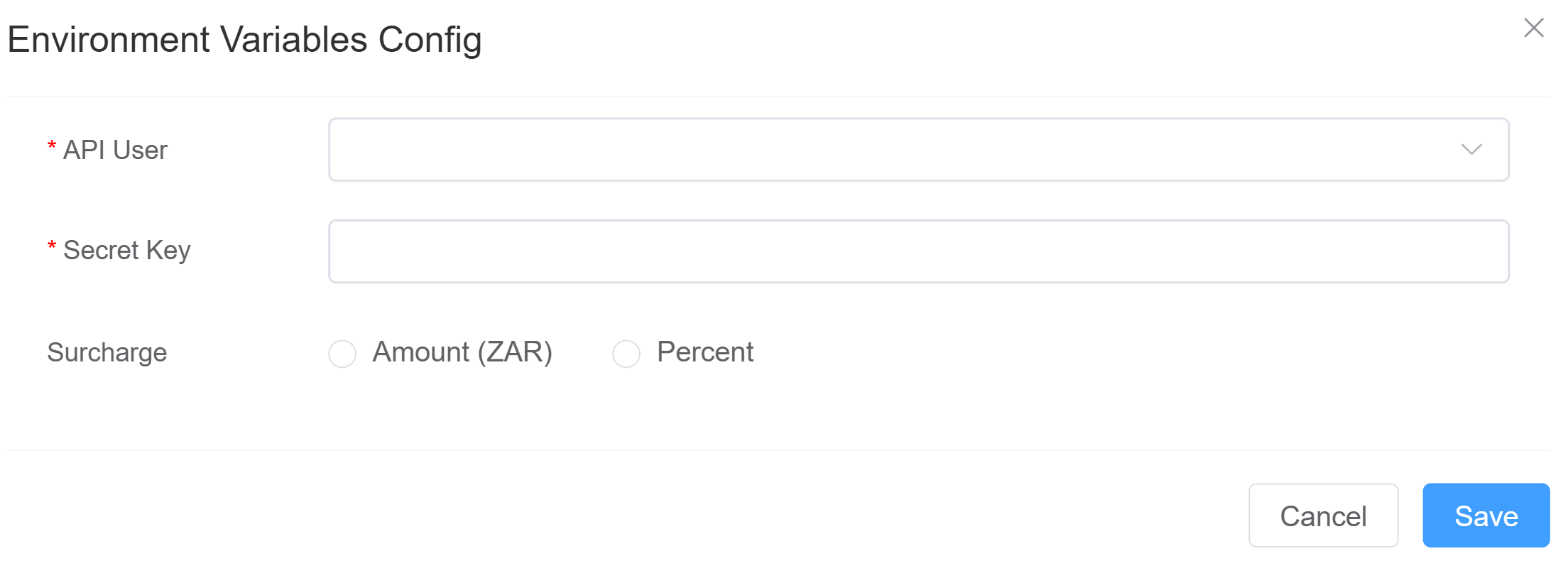 Secret Key. This key is required for authentication. Follow the steps here to generate and retrieve the API key. ConnexCS uses this key to securely authenticate and authorise all payment-related API requests. Surcharge: Configure an additional charge to be applied to payments.You can choose one of the following options:- Amount (ZAR): Applies a fixed surcharge in South African Rand (ZAR).