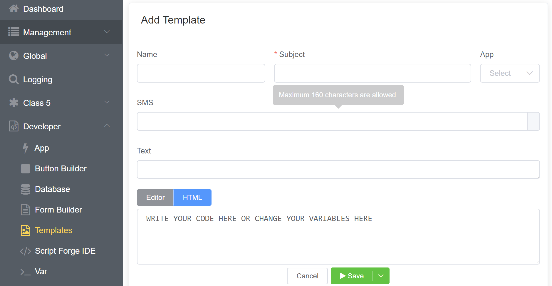 +button. - Enter the details like Name, Subject, App, SMS, Text.