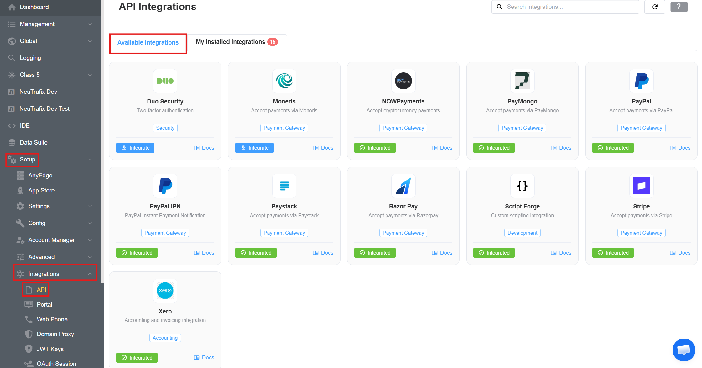- Navigate to Setup Integrations API.