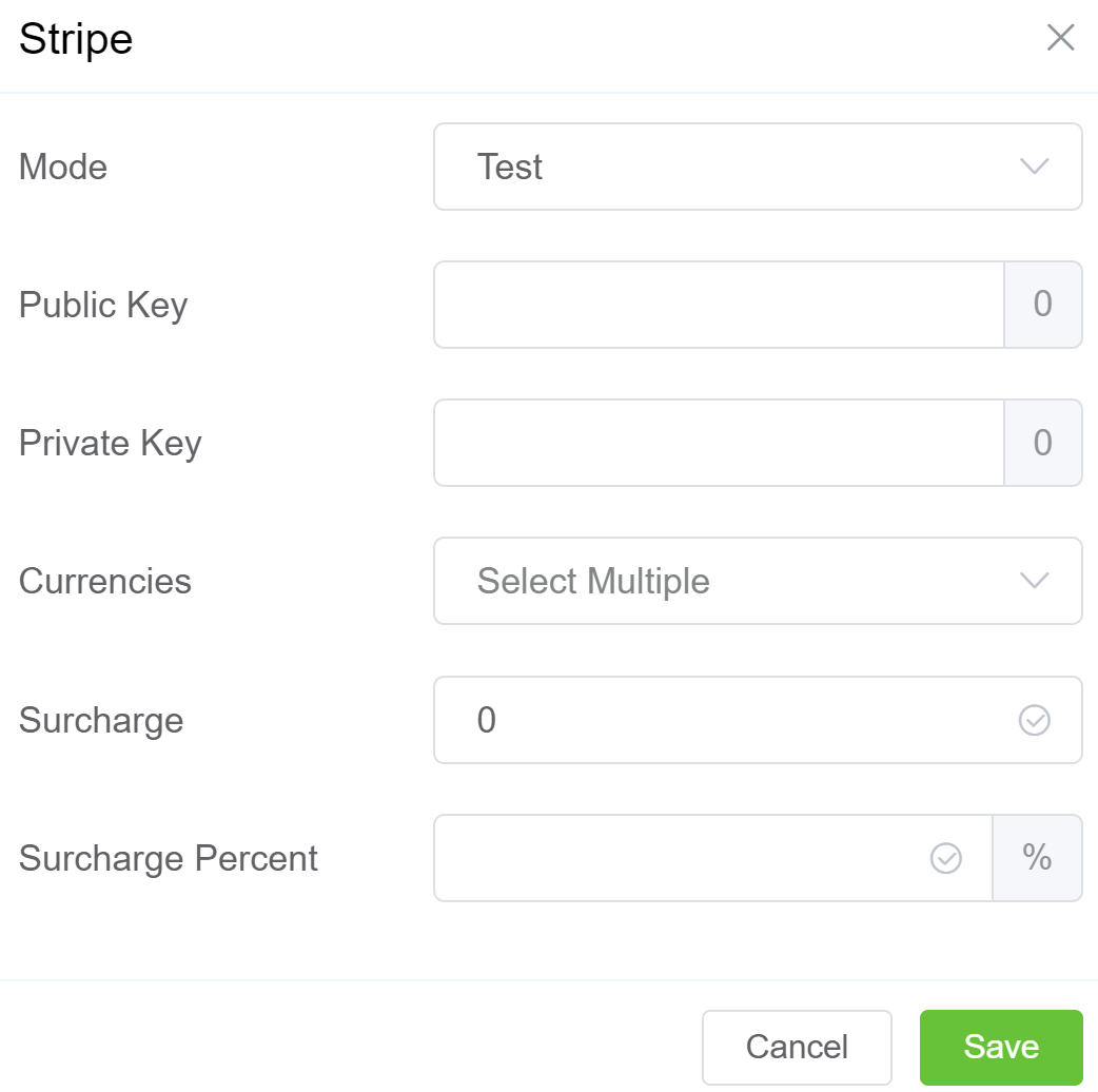 Testfor testing connections orLivefor an active account. - Public Key (Publishable) and Private Key (Secret): Access the Stripe Dashboard (login if necessary) to access your keys (from Stripe Support;
