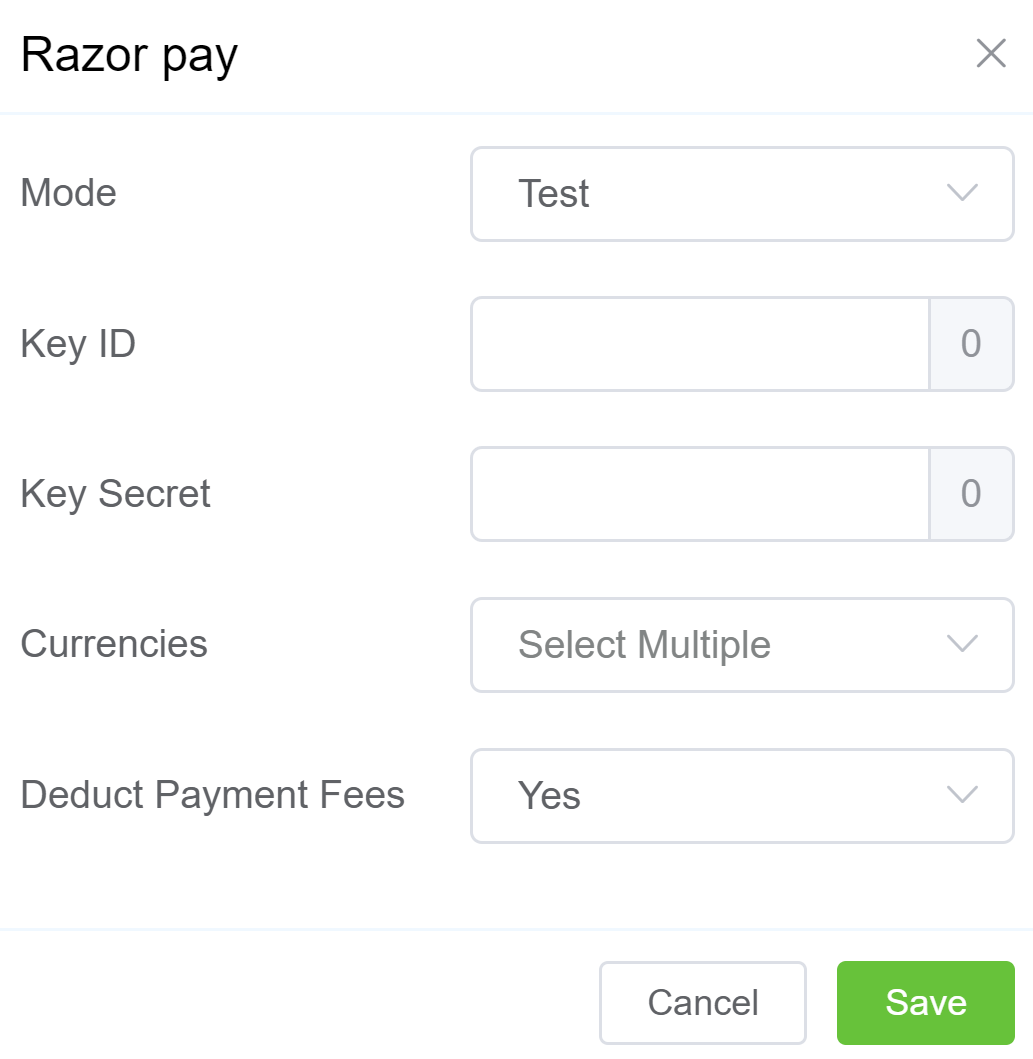 Testfor testing connections orLivefor an active account. - Key ID and Key Secret: Access the Razorpay Dashboard, go to Settings and Generate Test Key (from Razorpay support)