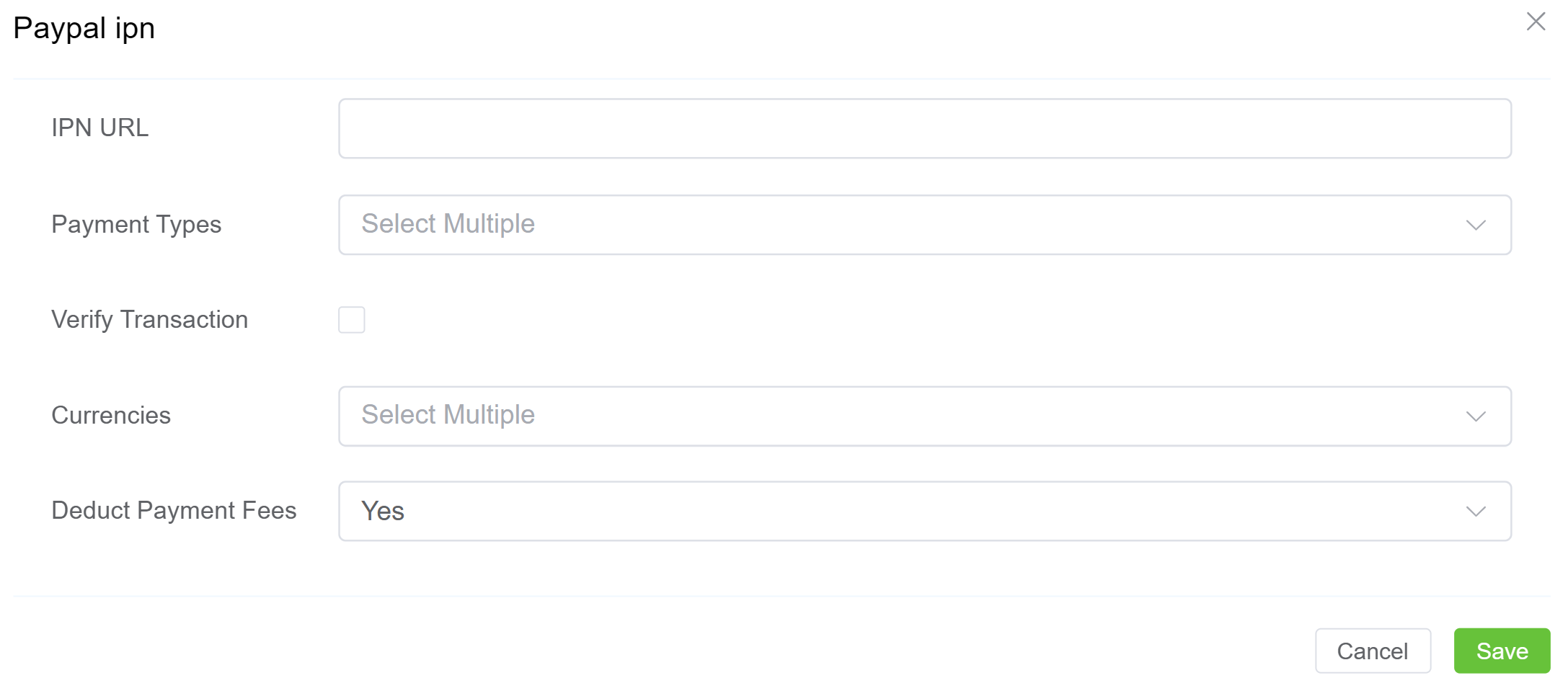 Integrateunder the PayPal IPN option. A window will appear prompting you to complete the various fields. - Update the following: