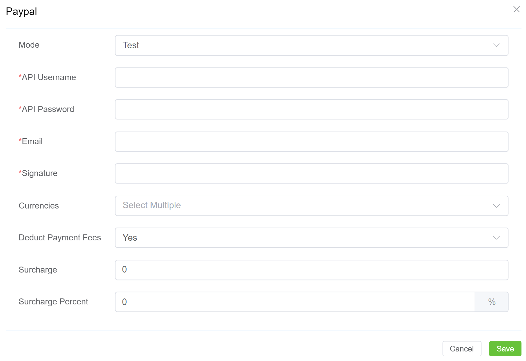 - Surcharge Percent: A percentage-based amount added to the invoice total for PayPal transactions.