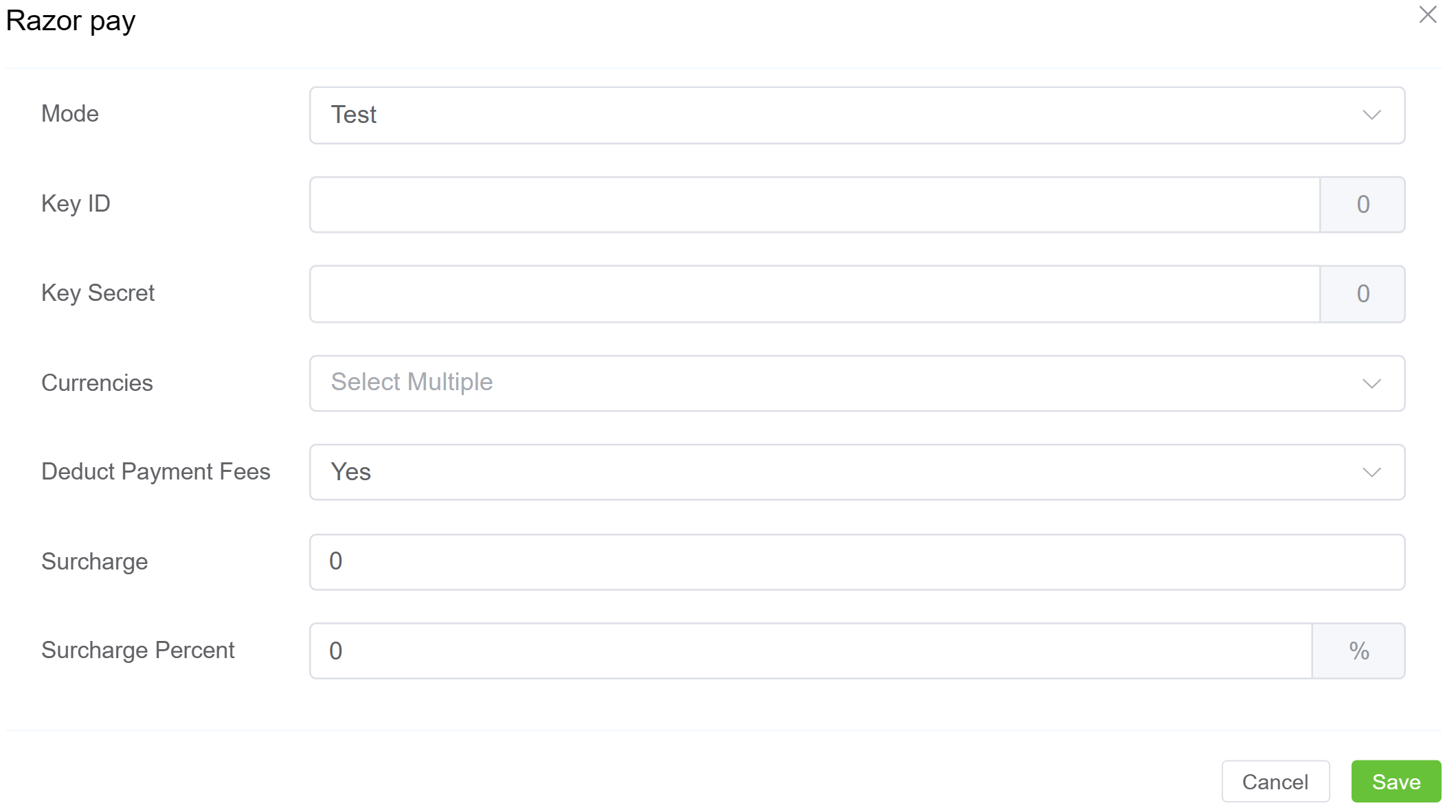 - Surcharge Percent: A percentage-based amount added to the invoice total for Razor Pay transactions.