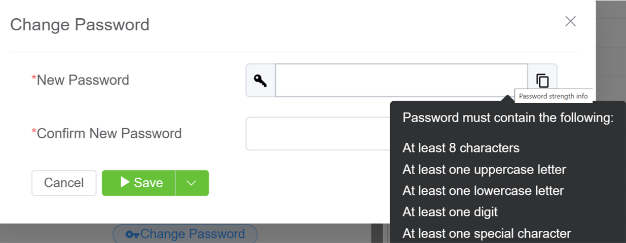 Change Passwordlink to the right of the User. - In the New Password text box, enter the new password.